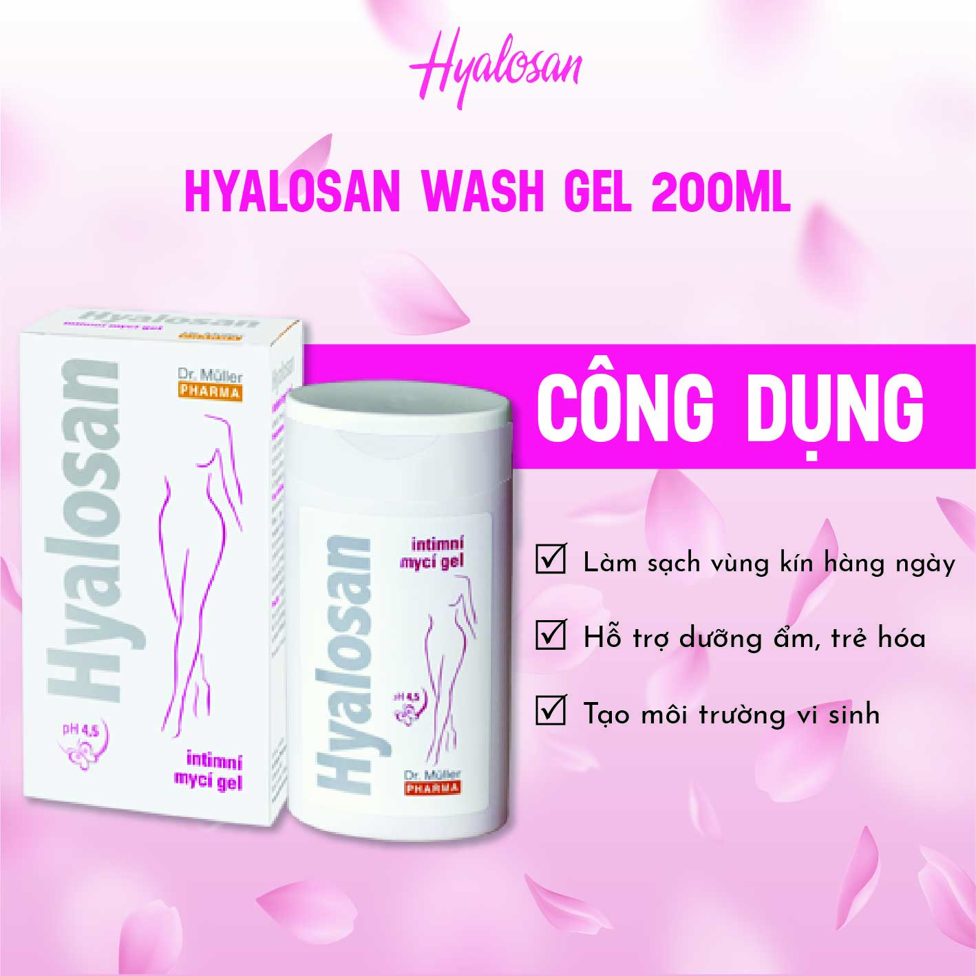 – Hyalosan wash gel là sản phẩm vệ sinh phụ nữ lý tưởng, đến từ châu Âu, được nghiên cứu và phát triển bởi hãng Dr. Muller Pharma, hãng dược mỹ phẩm số 1 tại Cộng hòa Séc. Sản phẩm hiện đã được phân phối và lưu hành toàn châu Âu và hơn 40 quốc gia trên Thế giới.